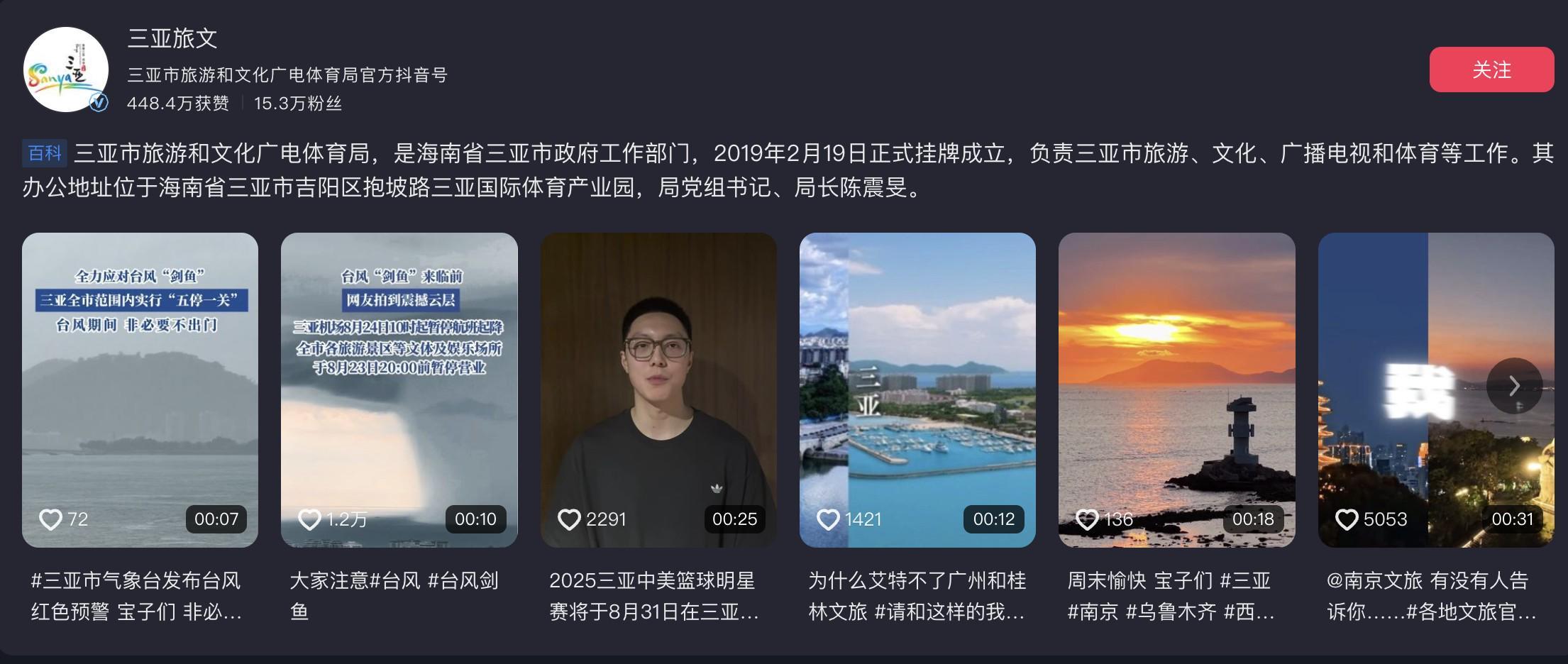 不过仅仅过了不到一天,三亚文旅就删除了徐杰的视频,目前三亚文旅的主页中只剩下了胡明轩一人的视频。